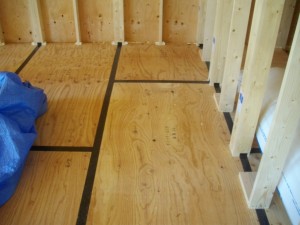 同じく、内部床合板の継ぎ目も気密テープで処理しています。